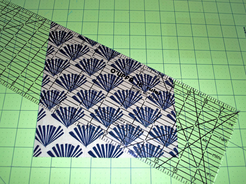 - Measure 4” up from the bottom along the right raw side edge and place a pin. Then draw a diagonal line from the top left corner down to this pin. Cut along this line. You can also use your cutting mat’s grid line to measure and cut the diagonal line, which is what we did.