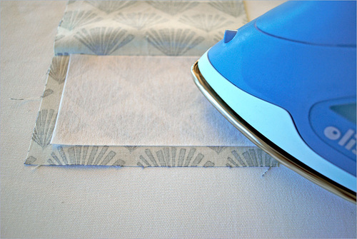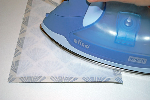 - Place the interfacing on the wrong side of one pocket panel. There should be ½” of fabric showing beyond the interfacing all all sides. Following manufacturer’s instructions, fuse in place.
