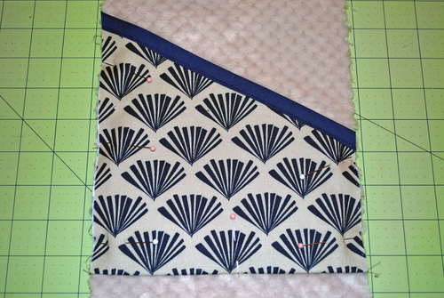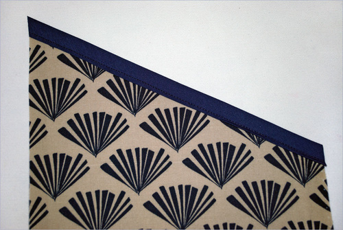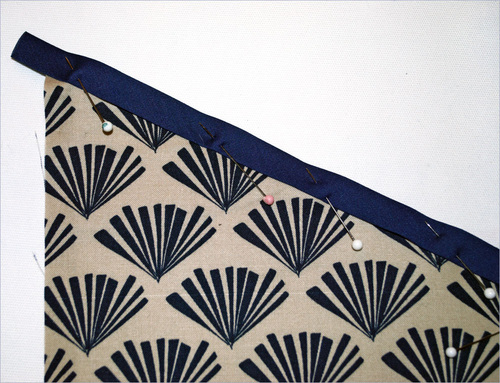 - Find the bias tape. With the panels wrong sides together, slip the tape over the diagonal raw edges and pin in place. The length of tape should extend beyond the pocket a bit at both ends. This is correct.