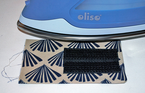- With the Velcro® stitched in place, re-fold each tab right sides together along the original crease line. Pin along the side and the one end that is closest to the Velcro®. The opposite end remains open.