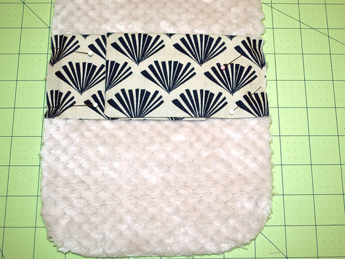 - Place the two main panels right sides together, sandwiching the pocket and tabs between the layers (remember, our Cloud Spa Cuddle looks the same on the front and the back). Pin in place, leaving an opening along the bottom for turning and stuffing.