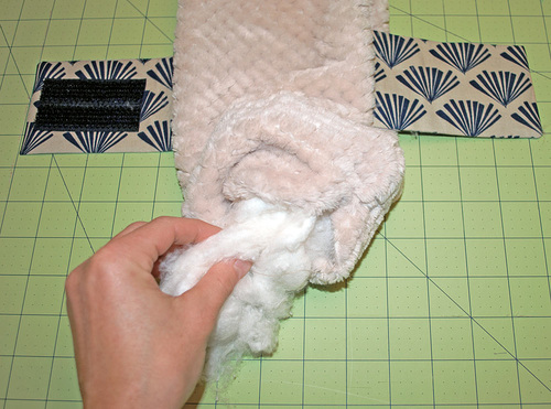 - Fill with the polyester fiberfill to a comfortable firmness. You don’t want it too hard or it will be uncomfortable as a pillow, but you also don’t want it too soft or your head will sink down to the seatbelt. It should be “just right,” Goldilocks!