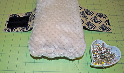 - With the Velcro® strips still just pinned in place, test how your tabs overlap. Working with Velcro® can be a bit of a brain-bender because your two separate halves must come together to adhere. With a directional fabric, as described above, it takes a bit more brain-bending to keep the pieces straight.