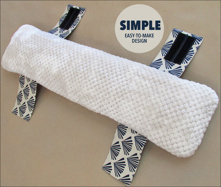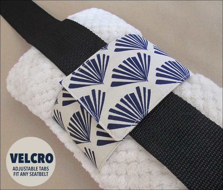 Our simple design features two adjustable overlapping tabs to attach the pillow to a seatbelt’s crosspiece.