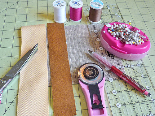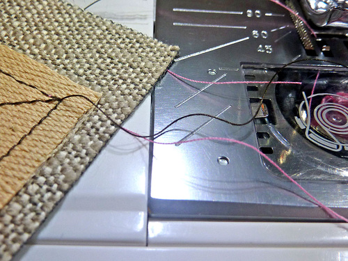 - Thread your machine with either matching or contrasting thread as indicated for your project. We used contrasting thread in two different colors (brown in the top and pink in the bobbin) so you could easily tell which thread was which when we hand-tied the tails.