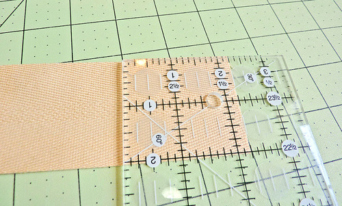 - Using a clear ruler and a fabric pen or pencil, measure for the height of the box plus your seam spacing. For our sample we used a 2″ box plus a ¼” seam spacing. We measured 2¼” up from the end of the strap and drew a horizontal line.