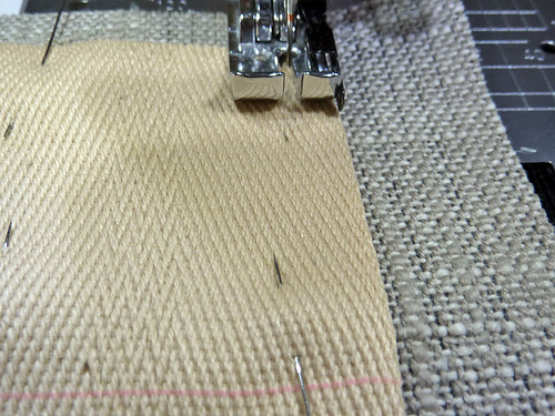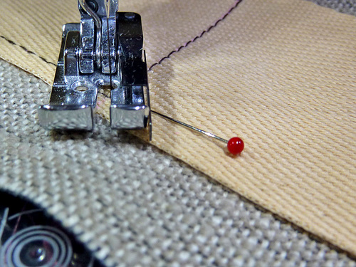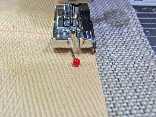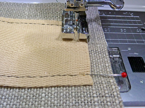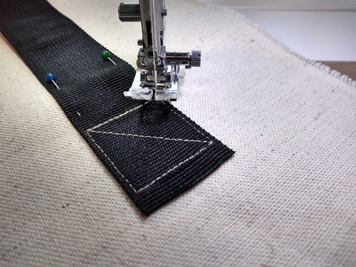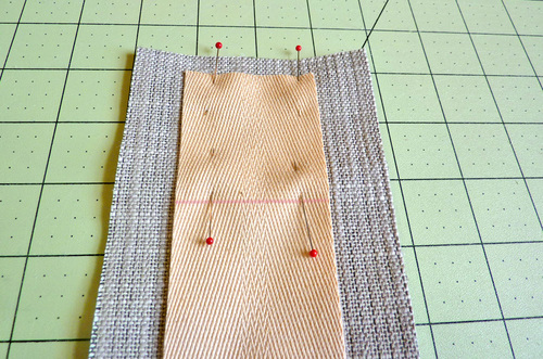 - Pin the strap onto the base fabric. You don’t need a lot of pins, one or two at the bottom edge and one or two at the horizontal marked line are plenty.