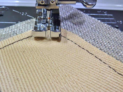 - Stitch across the bottom of the box, directly over the previous stitching. At the opposite bottom corner, again pivot 45˚ so you are aligned to stitch on the diagonal.