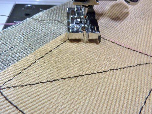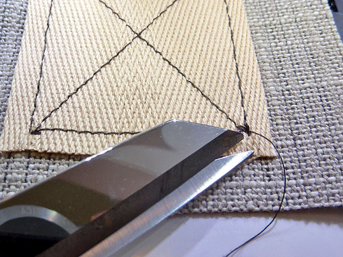 - Replace the project under the presser foot, dropping your needle in at the opposite corner and positioning the foot to create the intersecting diagonal line. Make sure your starting thread tails are long – again about 4-5″ is good.