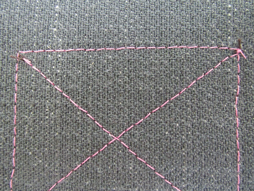 - Sew diagonally through the box to the upper right corner. Pivot and sew across the top of the box – as you did along the bottom, you are again sewing right on top of the previous line of stitching. End in the same upper left corner where you started.