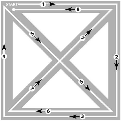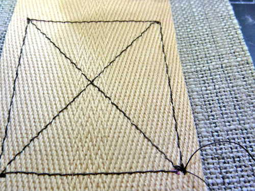 - The illustration below shows the eight lines that make up a reinforced X Box and the order and direction in which they are sewn. Take note that stitches 1 and 8 as well as stitches 3 and 6 are sewn one on top of the other. In the illustration below they are spaced apart so you can clearly see the sewing direction, but as described above with the photos, both the top and bottom seams are doubled.