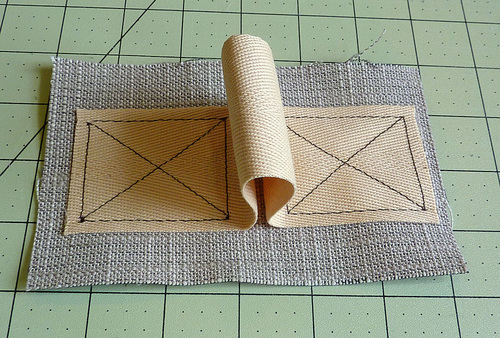 - Flip over the project so you are looking at the back of the X Box. Remember, we used two colors of thread so you could easily see the two strands: brown in the top (for the front) and pink in the bobbin (for the back).