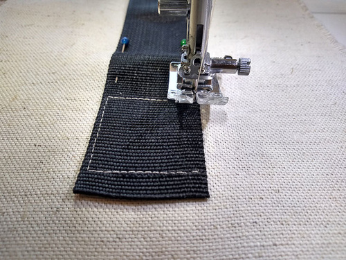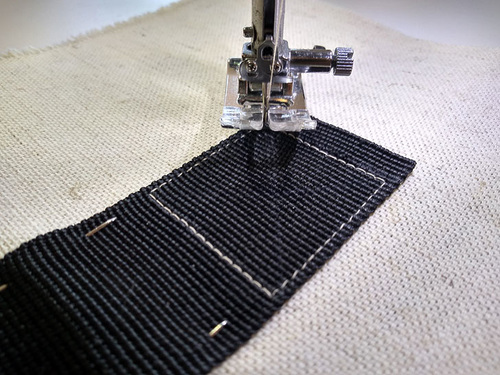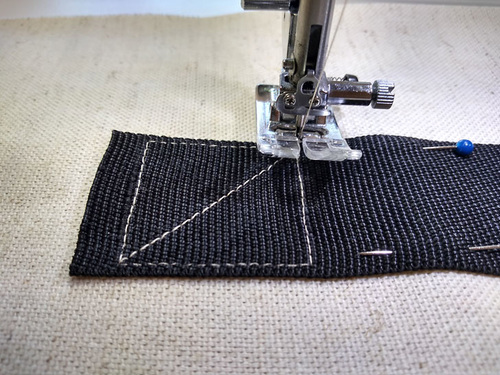 - With your strap in position, start in the upper left corner. Because this upper line of stitching will be doubled, you do not need to lock the seam to start. Instead, drop the needle at the start point and shorten the stitch length to 0.5mm. Take three to four stitches, then return the stitch to the desired length.