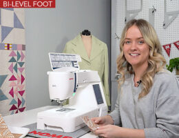As the name implies, the base of this unique presser foot is designed so it is slightly higher on the left side of the foot than the right. By placing the foot along a seam, this split level guides the foot along the seam, creating a consistent line of edgestitching or topstitching. The foot is also perfect for finishing non-seamed edges, such as around the top of a tote, along the edges of a patch pocket or when attaching straps to a bag. It’s available for Janome 5mm, 7mm and 9mm machines. Click to find all the details.