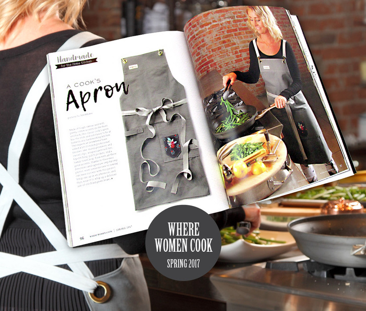 We are very proud to once again be featured in the Handmade for the Home Kitchen column of Where Women Cook! We designed a brand new apron expressly for their readers. Tough canvas on the front with pretty cotton accents on the back, this classic cook’s apron has the style and substance to be at home in any hardworking kitchen. It is also available in our Sew4HomeShop on Etsy.
