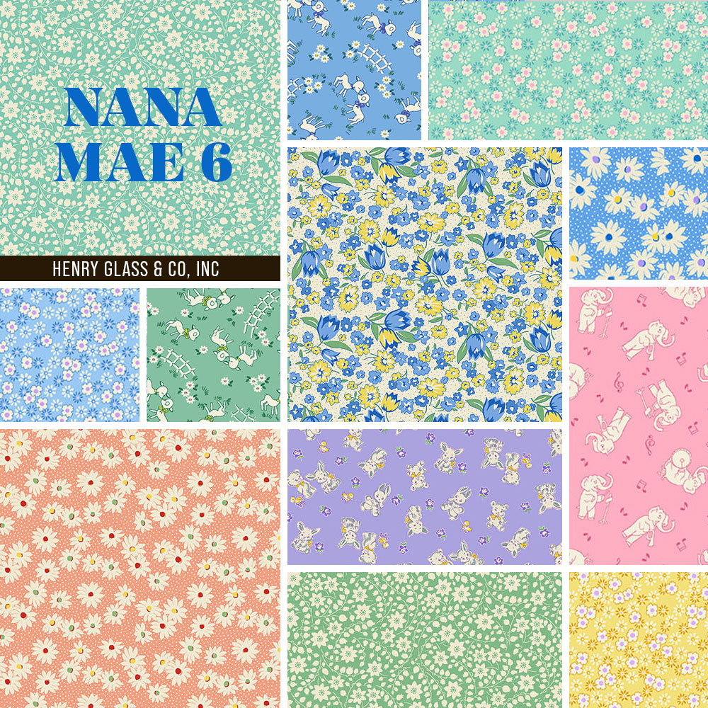 1930s reproduction fabrics are patterned after the cotton feed sacks sold during the Great Depression. For families trying to survive hard times, they used the feed sacks for new clothes as well as curtains and linens for the home. The prints in the Nana Mae 6 collection replicated this same sweet, petite, and nostalgic style – perfect for our nursery themed nesting basket set. The soft pastels and tossed motifs are easy and fun to mix and match, and we loved the tiny animal prints.