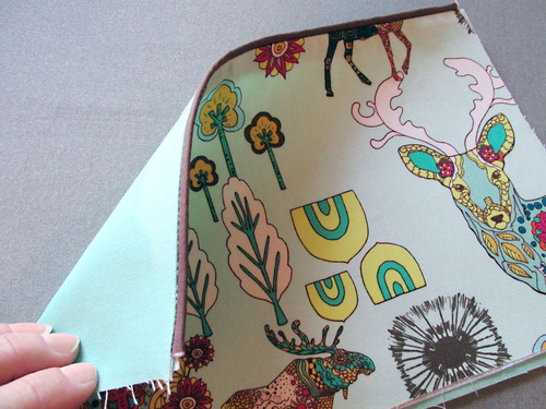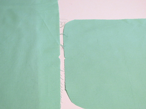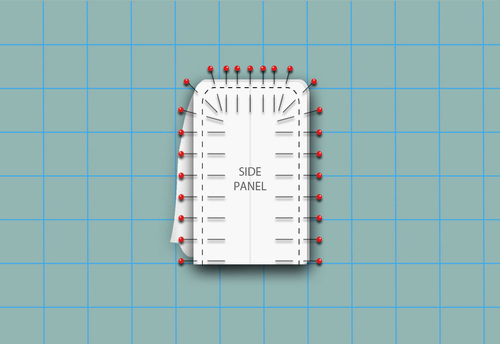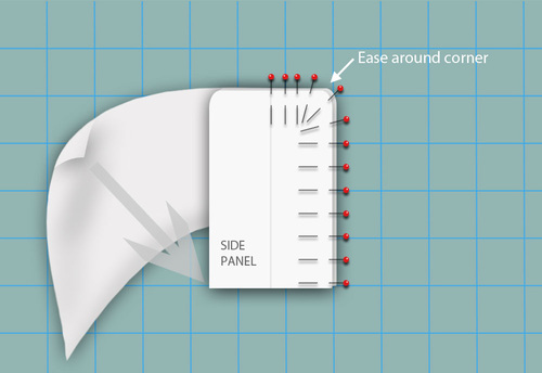 - Fold the main panel down, wrapping and easing it around the rounded top corner of the side panel. Move down the side, pinning the two layers right sides together. The bottom of the main panel should match up with the bottom square corner of the side panel.
