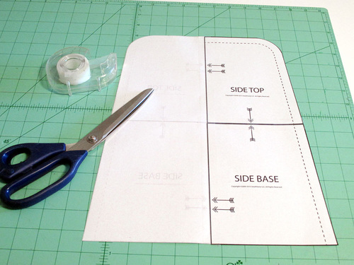 - Flip over one copy of each set and butt together (do not overlap), aligning the horizontal arrows printed on the pattern. Tape together. Then, aligning the vertical arrows of the top and bottom, butt together the top and bottom halves and tape together to create the full pattern piece.