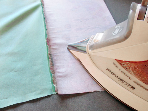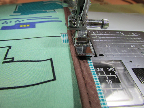- Using a ½” seam allowance, stitch the panels together. Press the seam allowance down towards the accent panel.