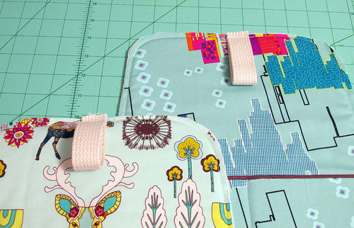 - Fold each 6″ length of webbing in half to create a loop and place the raw edges of a loop at the top center of each panel. Machine baste in place to secure.