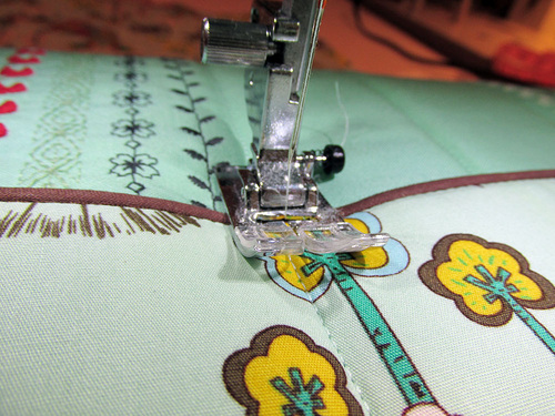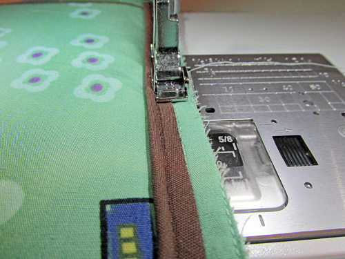 - Attach a Zipper foot to stitch the layers together. Remember above when we told you to make sure your piping basting seams on the panels had a contrasting color in the bobbin? You can now use this visible stitching line as a guide line to stitch the panels in place, guaranteeing you will be stitching right along the piping cord.