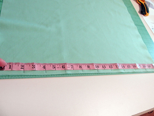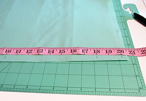 - Working on the wrong side of the fabric panel and using a measuring tape, measure and mark along both 21″ sides of the 21″ x 22½” main panel. Place the first mark ½” in from the outer raw edge to account for the seam allowance, then measure in 2″ increments across the entire 21″ width.