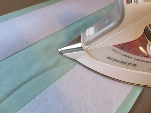 - Place the three 4″ stabilizing strips against the wrong side of the panel, using the lines as your guide. The outer edges of the right and left strips should be aligned with the ½” lines at either side of the panel. The center strip should sit between the 8″ and 12″ marks at the center of the panel. Following manufacturer’s instructions, fuse the strips in place. Pin in place at the outer edges if using tear-away