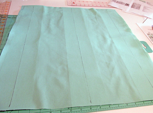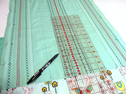 - Using a long straight edge, connect the top marks with the bottom marks with continuous vertical lines. You are working on what will be the wrong side of the panel, but it is still a good idea to use a fabric pen or pencil that will easily wipe away or disappear with exposure to the air or the heat of the iron.