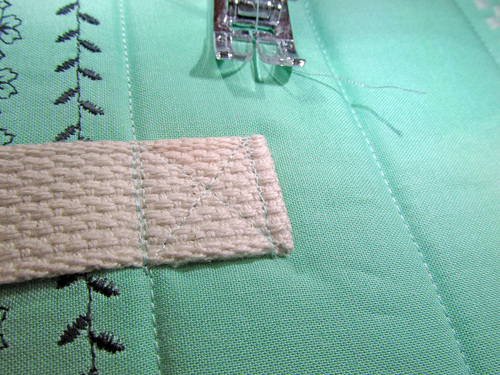 - Secure each end with an approximate 1″ X-box of stitching, lining up the inner edge of each box with a quilting line on the panel.