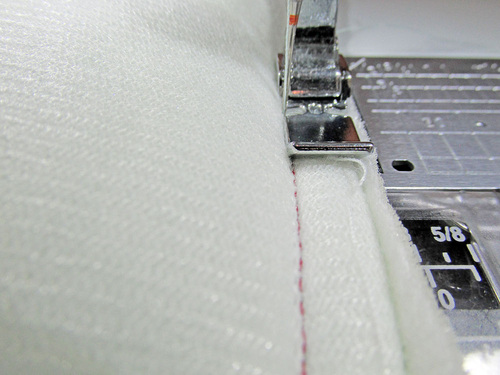 - In addition, make sure your bobbin thread is one that will stand out against the white of the foam interfacing. This is important as you’ll use this bobbin seam line as a guide line later when stitching the side panels to the center panel.