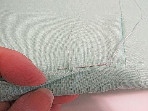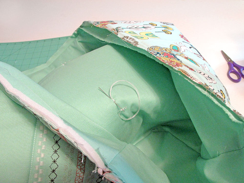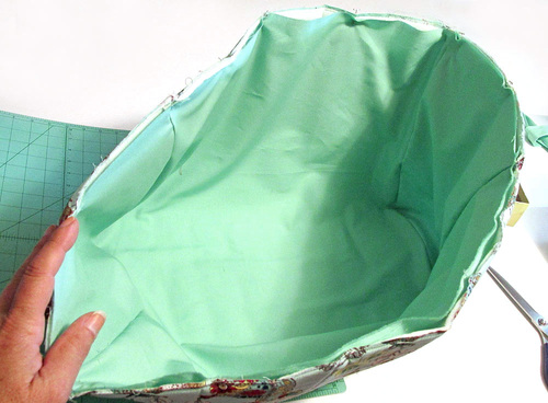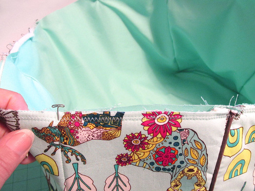 - Thread a hand sewing needle. Unlike a lined bag where the force of gravity helps keep the lining in place, the lining of this sewing machine cover will want to drop out when you lift the cover off the machine. To help hold it in place, hand stitch through all the layers at either end of the handle and at the top of each side panel seam.
