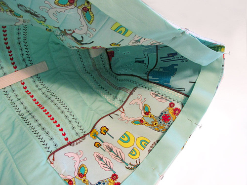 - Create a pocket dividing line, using the quilting stitch line to the right of the center decorative stitching block as your guide line.