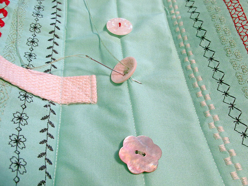 - Using a variety of thread colors from the decorative stitching lines, stitch each button in place through all the layers.
