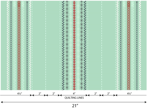 - Again using your original 2″ increment guidelines, re-draw the quilting lines as necessary. There is a quilting line to either side of the center decorative stitching block, one line at the inner edge of both the left and right stitching blocks, and one line down the center of each blank section between the decorative stitching blocks. That’s six quilting lines total as shown in the drawing below.