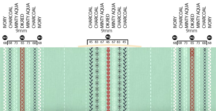 NOTE: On the Skyline S5, we used the following stitches: from Mode 1: #68; from Mode 2: #45, #46, #56, #67, #68, Below are close-up illustrations of our stitch patterns with their corresponding thread colors. - Start with the center line of each stitch group. For the best and most consistent stitching, always stitch in the same direction on the panel. We also recommend using a Start/Stop button control rather than your foot pedal if you have this feature on your machine. This guides the fabric evenly and at a steady pace, which gives you a beautiful finish. Although you may think you are delivering even pressure with your foot pedal, it’s very easy to drift into a sporadic slow-fast-slow pace, which can put stress on the fabric and thread and cause the stitches to form less perfectly.