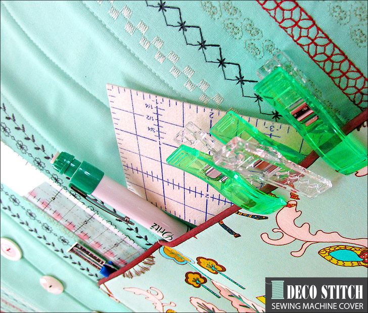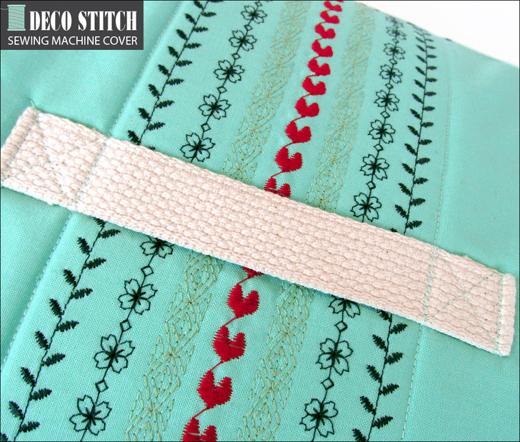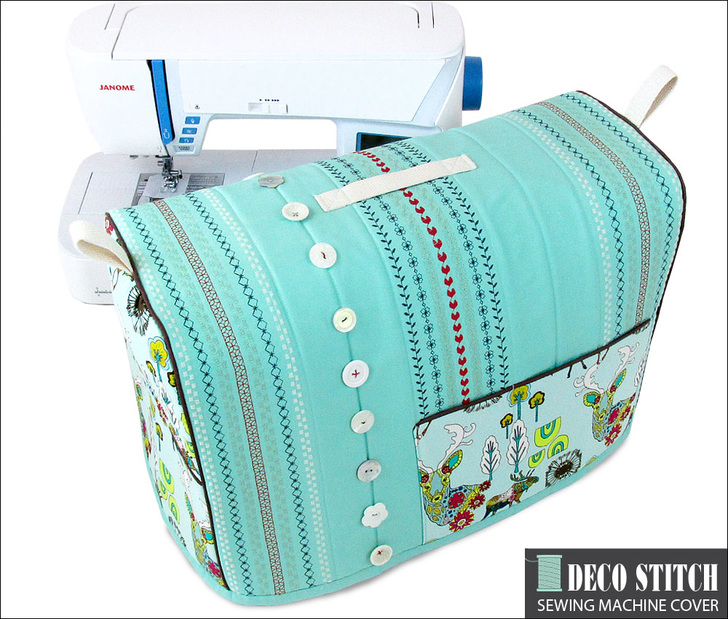 Doesn’t your trusty machine deserve a brand new outfit?! A cover keeps your machine protected from dust and sun exposure when not in use. Plus, a custom sewn cover in gorgeous fabric can be a very pretty alternative to what may have come with your machine. Decorative stitching in multiple colors plus button accents add a bit of flair to our design. Have fun with your fabric selections to best match your décor; we recommend coordinating two prints with one solid – a solid is the best background for the decorative stitching. Read on to see how we measured our Janome Skyline machine to determine our cuts so you can customize to your model. There’s also a pattern download provided for the curved side panels.