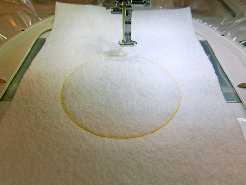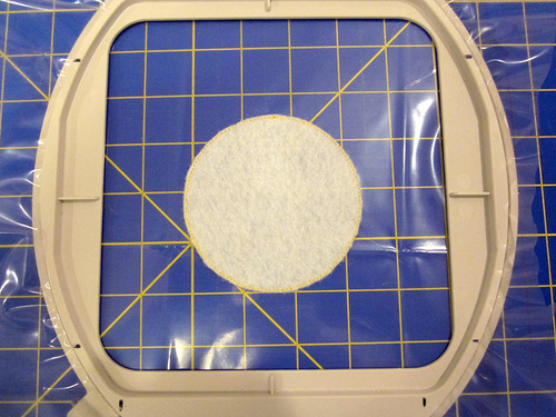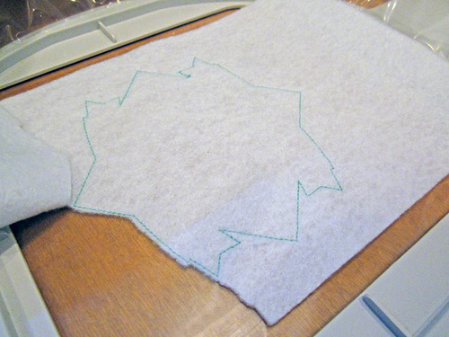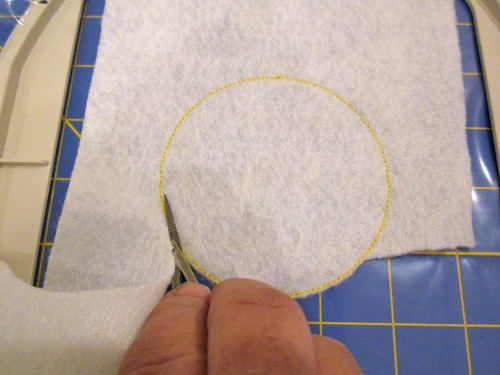 - Remove the hoop from the machine and using small appliqué scissors, trim the felt close to the outline. Trim just the felt, not the stabilizer.