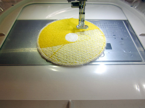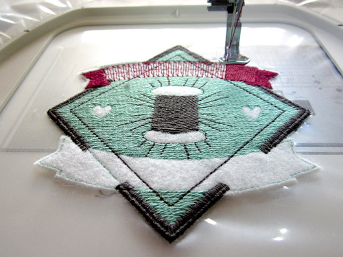 The designs require an extra heavyweight water soluble stabilizer. We used and recommend Sulky Ultra Solvy. It gives a perfect amount of support to a dense design stitched with the 30wt thread. A layer of felt provides the stitching surface. You’ll be delighted at how easily the finished patch pulls away from the hoop.