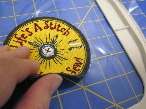 - Un-tape the bottom of the Life’s A Stitch patch and smooth it down into position.