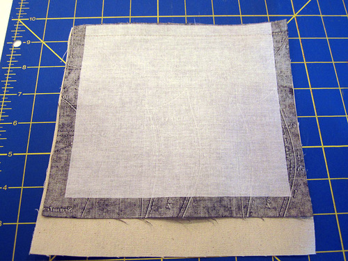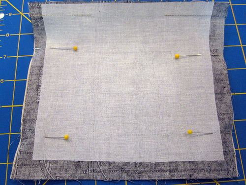 - Find two of the pocket lining panels and two of the interfacing panels. Center an interfacing panel on the wrong side of each lining panel. The interfacing should be flush with the top raw edge of the fabric panel, but should sit ½” in from the raw edge along both sides and across the bottom. Following manufacturer’s instructions, fuse in place.
