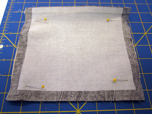 - Match the short seams of the accent base to the pins marking the sides of the tote body. Pin all around.