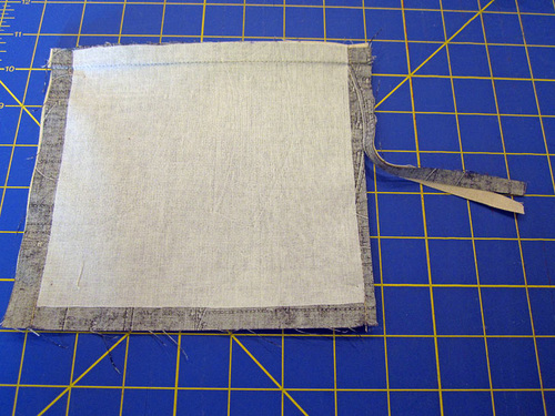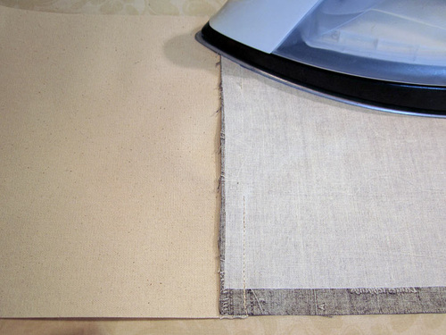- The interior pocket is created in much the same manner except when stitching the top seam, leave an approximate 3” opening at the center for turning the pocket (remember to lock your seam at either side of this opening). You can see our center opening in the photo below as we press the seam allowance towards the canvas.