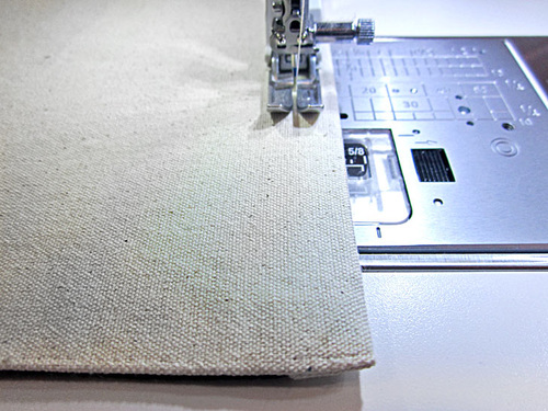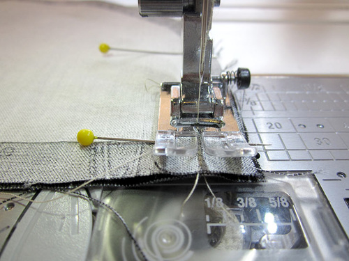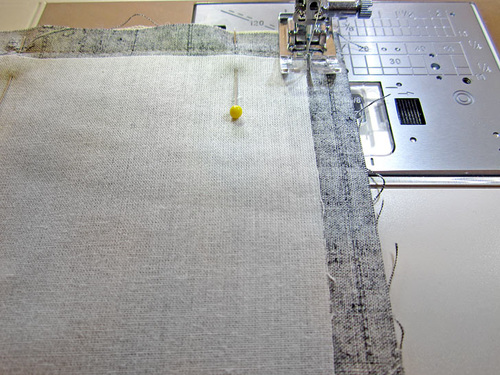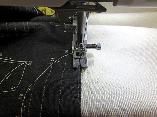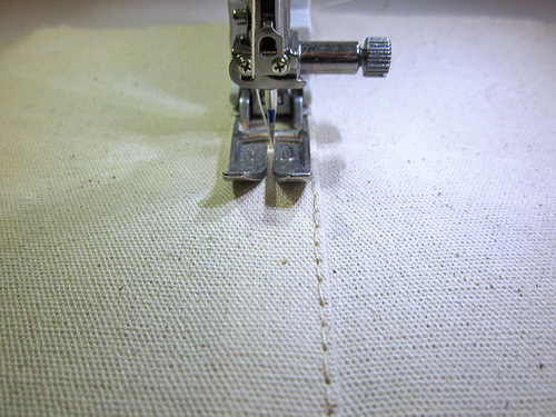 - Re-thread the machine with Cotton + Steel 50wt to match the lining in the top and bobbin. Re-set the stitch length to normal.