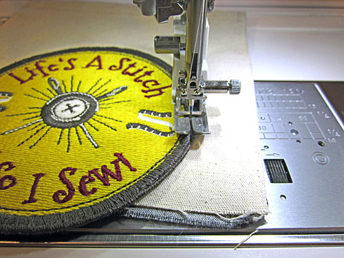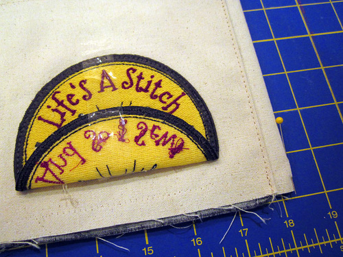 - Place the Life’s a Stitch patch on the second exterior pocket. It should be centered side to side and sit 2½” down from the upper edge of the pocket. This means the bottom of the patch will hang over the lower edge of the pocket. Secure in position with as above with pins or optional spray adhesive or wash-away basting tape.