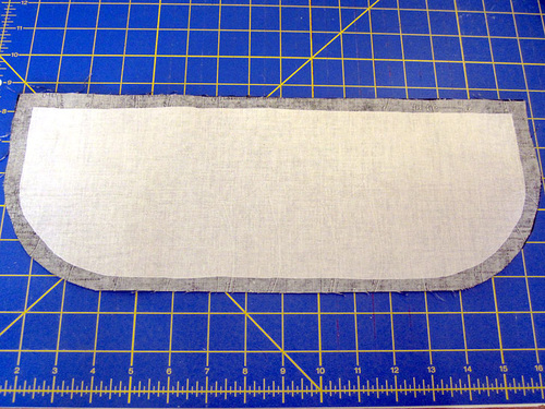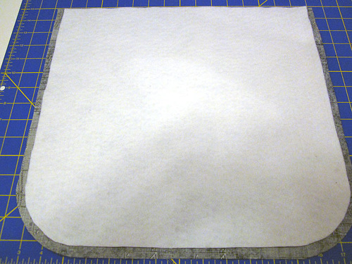 Using the assembled base pattern, but cutting along the dotted seam allowance line rather than the solid outer line, cut TWO. - From the fusible fleece, cut TWO 15” wide x 14” high; using the trimmed base pattern as a template, round the bottom corners of the fleece panels.