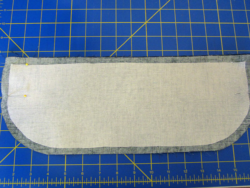 - Find the two lining panels and the two fusible fleece panels.Place a fleece panel on the wrong side of each lining panel. The fleece and the fabric should be flush along the top raw edges, but there should be ½” of fabric showing beyond the fleece along the sides and around the curved bottom edge. Following manufacturer’s instructions, fuse the fleece in place.