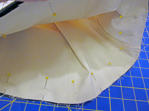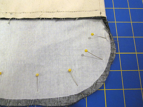 - Align the remaining raw edges of the curved bottom. Pin in place.
