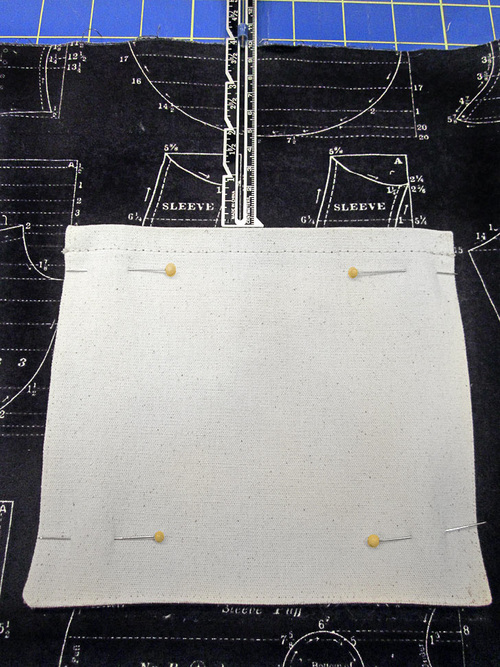 - Find the interior pocket. Place it right side up on the lining panel. The pocket should be centered side to side and its top edge should sit 4” down from the top raw edge of the lining panel. Pin the pocket in place.