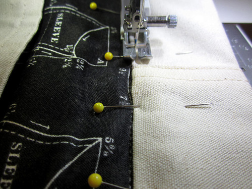 - As you did with the exterior pockets, re-fold right sides together, aligning the sides and bottom. Pin in place along the sides and bottom.