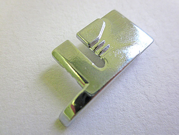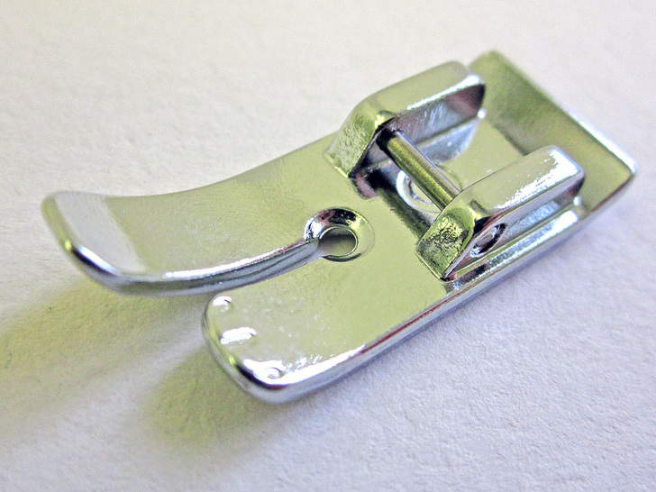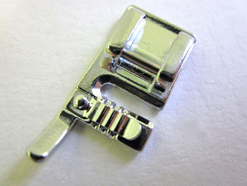 Use a straight stitch presser foot (shown above) or a straight stitch plate (shown below). Or use them in combination. They both help keep the fabric from being pulled down into the machine as stitches are formed.